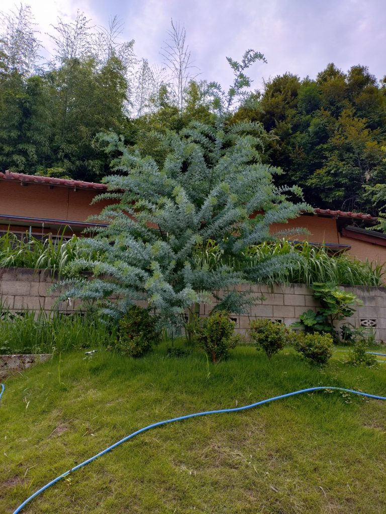 今、駐車場兼資材置場として使っている場所に小さい庭みたいなのを作って少しずつ花や実がなる木を植えたりしていて、やり始めた時は芝生と花とかミモザを植えたんですけど、あれから2年ぐらいたち小さかったミモザがでかくなりすぎて最早どおしていいかわからなくなっています。